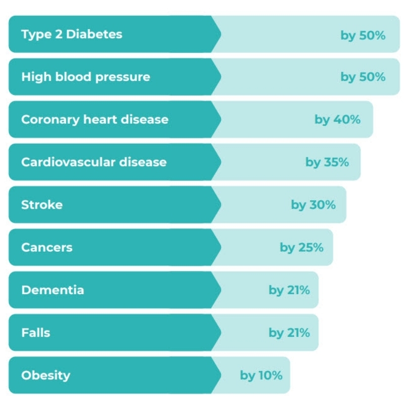 Regular physical activity reduce their risk of the following conditions: Type 2 diabetes, high blood pressure, coronary heart disease, cardiovascular disease, stroke, cancers, dementia, falls and obesity (refer to picture)